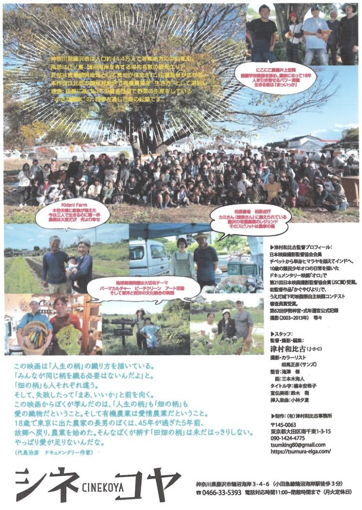 映画チラシ 第二弾 ハタケのチカラ フライヤー表紙(左)・裏表紙(右) 画:三本木海人 タイトル・デザイン:橋本安希子 初監督作品 かぐやびより フライヤー表紙 イラストを制作した 長美里 さん 映画チラシ・裏面 表紙を描いた 萩原ありさ さん タイトル文字を書いてくれた、左サイド 小林大真 君 と、右サイド 私(津村和比古)