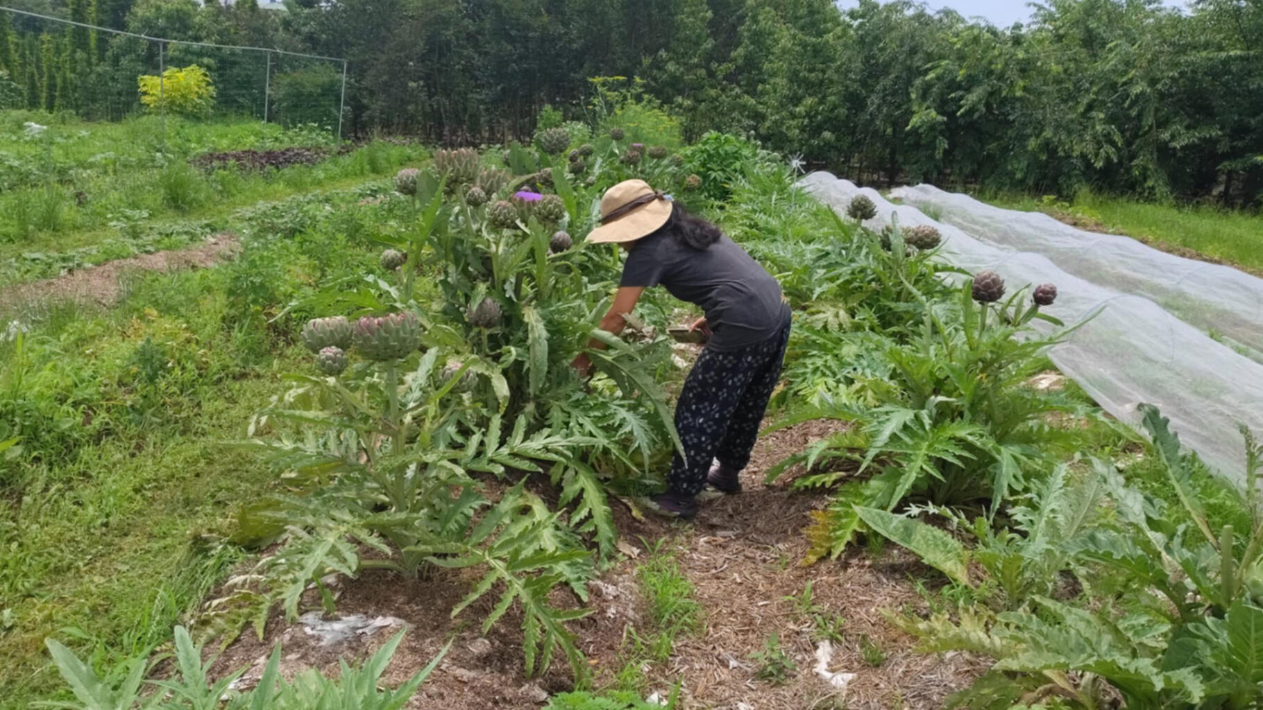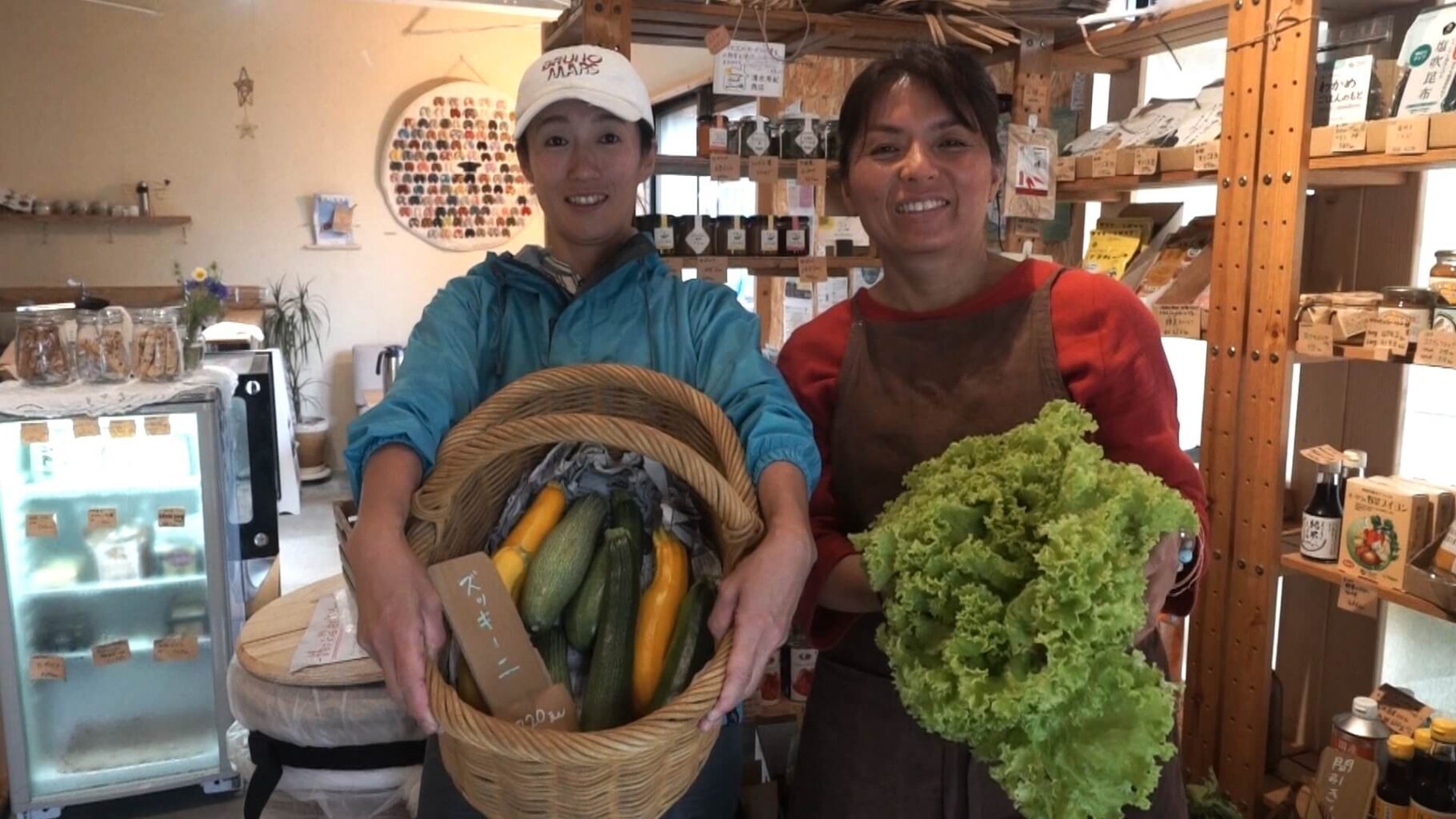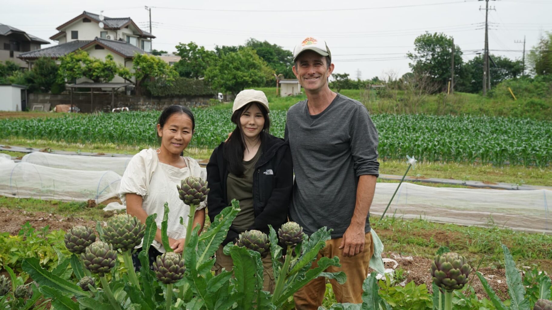 ウオーレンさんと康子さん、手伝いに来た娘さんとアーティチョークの畑にて。家族は4人で、コロナ禍の時にカナダから移住して来ました。