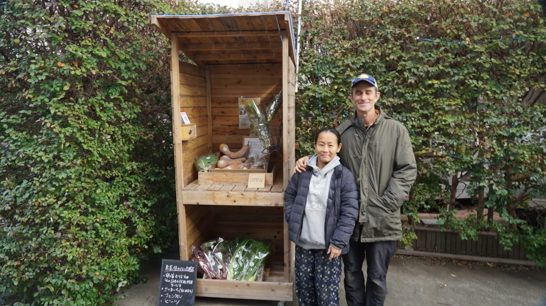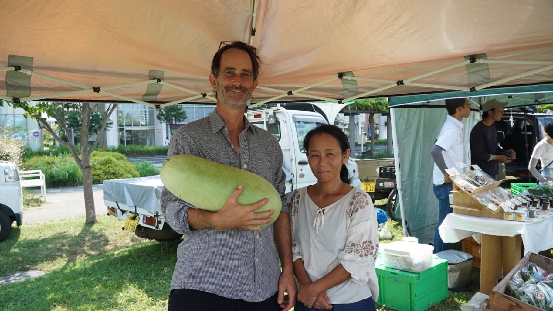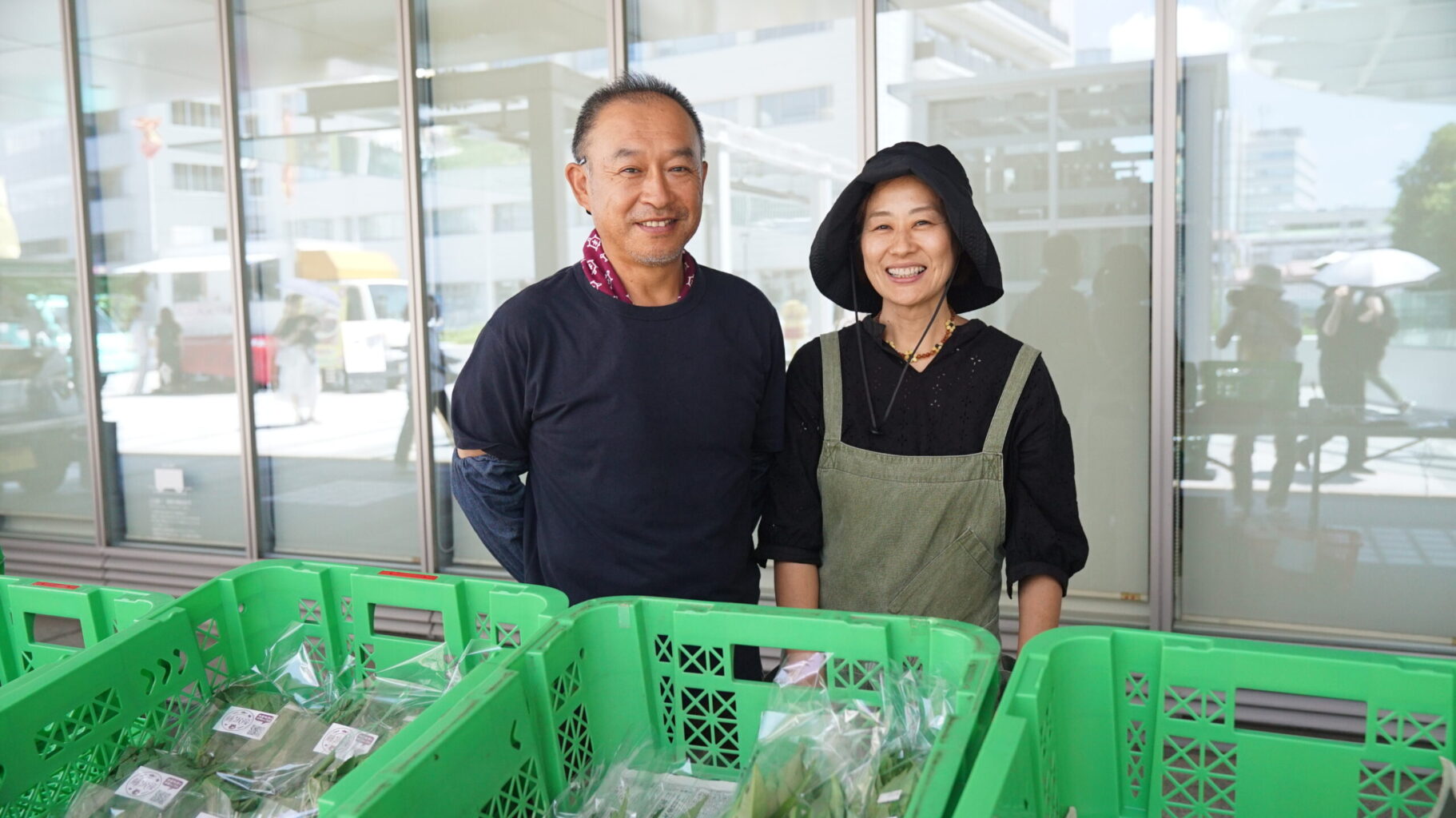 毎週水曜日、藤沢市庁舎前サンセット・マルシェで奥様の晴美さんと一緒に販売する時の一コマ。